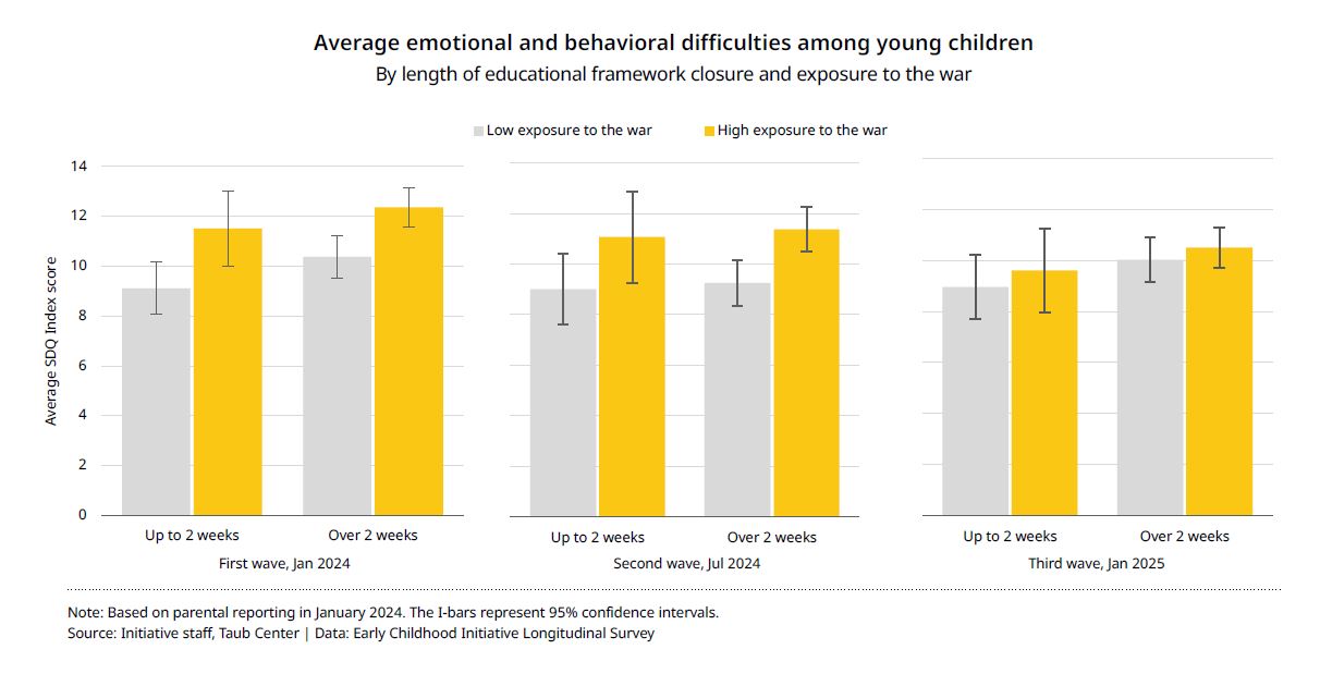 The study found that young children whose educational frameworks were closed for more than two weeks at the start of the war, and who experienced a high level of exposure to war-time events, suffered from more severe emotional and behavioral difficulties than did children who were less exposed to the war. The gaps were statistically significant in the first two waves of the survey, but after a year (in the third wave) they had almost completely disappeared, regardless of the length of the closures.