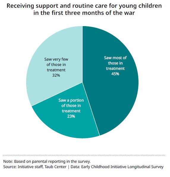 Survey participants were asked whether their child required routine treatments and support (such as speech therapy, well-baby clinic checkups, health fund follow-up, and the like), and whether the child continued to receive them during the first three months of the war. According to the survey, about two-thirds of the children did not require any routine treatments. However, among those who did, only 45% continued to receive most or all of the treatments they needed in the first three months of the war. In other words, more than half of the children in the survey who required routine treatments did not receive them as needed during this period.