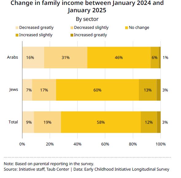 The survey examined reported changes in the incomes of families with young children as a result of the war, presenting parents’ reports on changes in family income between January 2024 and January 2025, broken down by sector. The findings show that a higher share of Arab parents reported a decline in their family income than did Jewish parents: 16% of Arab parents reported a large decrease in income versus only 7% of Jewish parents, and 31% of Arab parents reported a slight decrease compared to only 17% of Jewish parents.
