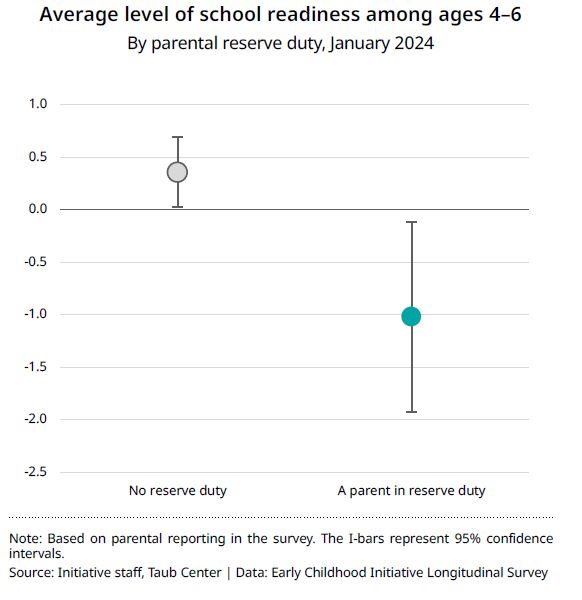 In the third wave of the survey, parents were asked to assess their young children’s readiness for school in light of their reserve duty following the outbreak of the war. The findings show that children whose parents were called up for reserve duty during this period were rated as having lower school readiness than children whose parents were not called up. This result was obtained after controlling for a wide range of demographic, family, and emotional variables, such as family structure, family size, and the emotional state of the parent who remained at home. This finding may reflect the consequences of a parent’s absence from home during an emergency, and the particular challenges it creates for young children at the critical stage of preparing to transition into formal educational settings.