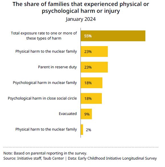 About 55% of families surveyed in the first wave (January 2024) reported direct exposure to the war in one or more of the following ways: physical injury or psychological harm to an immediate family member or in their close social circle, evacuation from their home, or the enlistment of a parent for reserve duty in the security forces.