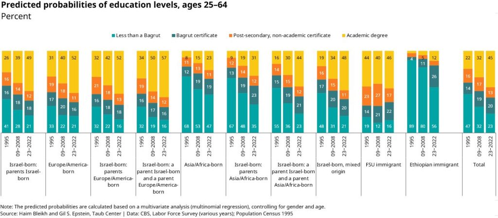 Rising education levels across all origin groups, at an especially high pace among Asian/African origin and Ethiopian immigrants — but gaps with European/American origin remain large