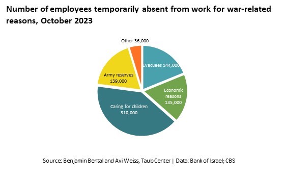 The significant effects on the labor market in Israel. The temporary absence from work of about 20% of the work force (more than 900,000 workers) and in particular young workers, many of whom are employed in the high-productivity high tech sector, alongside the direct costs of the war, are affecting all of the country’s economic systems and will continue to do so for a long time to come. In October, about 144,000 workers in the areas adjacent to Gaza and along the northern border were forced to leave their places of work after being evacuated; about 310,000 parents of young children were absent from work when the education system stopped operating normally; and, about 135,000 workers were absent from work due to damage to their place of work. In November, the number of absent workers fell from about 900,000 to 500,000.