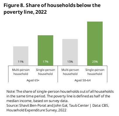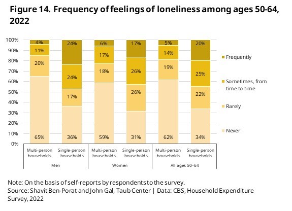 A first-of-its-kind study in Israel, published by the Taub Center, reveals that there are currently about 144,000 men and women aged 50–64 living in single-person households, many of whom lack the resources, family, or institutional support needed to cope with the material, physical, and emotional hardships that undermine their quality of life.