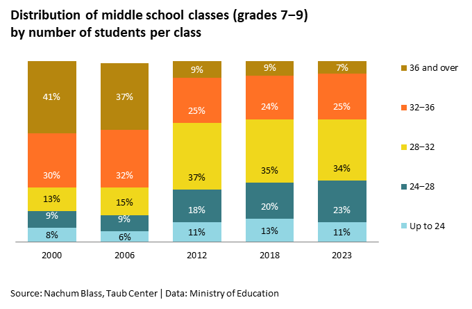 In the past decade, there has been no improvement in class sizes in middle schools. In 2023, a third of students still studied in classes with more than 32 students, the same as in 2013. However, it is important to note that in 2000, this figure was 71%. The situation is particularly severe in Hebrew State education, where 59% of classes have more than 32 students, compared to only 14% in State-religious education, 14% in Haredi education, and 15% in Arab education. In Bedouin and Druze education, there are almost no middle school classes with more than 32 students.