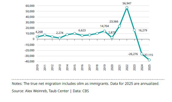In 2024, for only the fourth time in this century, net migration — the number of immigrants entering Israel minus the number leaving — turned negative. The number of people who left Israel exceeded the number who entered (including new immigrants) by 26,000. In 2025, this trend is expected to continue, with the gap projected to reach 37,000. Given the CBS method for calculating migration, a negative net migration balance is also expected in 2026. This plunge into negative figures marks a major change in Israel’s migration patterns, with no precedent in the country’s history.