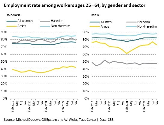 The extent of recovery varied across segments of the population. A comparison by gender shows that while the rate of employment among men in the summer of 2022 was equal to that in the summer of 2019 (82%), among women, there was an increase of about 2 percentage points (77% vs 75%). Similarly, the rate of employment among women in general returned to its former level and even surpassed it. There was also an impressive recovery among Arab men. In contrast, the rate of employment remained lower than prior to the pandemic for Haredi (ultra-Orthodox) men.