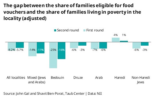 The comparison reveals that the average gap between the percentage of families eligible for food vouchers and the percentage of families living in poverty narrowed slightly, from 8.2% to 5.7%. However, the changes in the gap across different types of localities were uneven. In Arab localities, the gap narrowed the least, while in Bedouin localities, it decreased significantly (though these localities still show the largest gap). In Haredi localities — the only ones where a positive gap was found in the first distribution round — the gap also narrowed but remains the only positive gap.