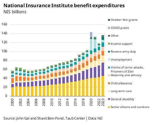 With regard to social security, in 2023, spending on National Insurance Institute benefits increased significantly, reaching approximately NIS 136 billion. This extraordinary increase was partly driven by war-related needs, including benefits for victims of hostilities, unemployment payments, reservist compensation, and grants for evacuees. Additionally, there was a notable increase in spending on general disability allowances. The researchers show that expenditure grew across all National Insurance benefits, except for income support allowances, which continued their downward trend.