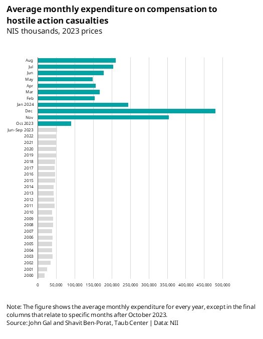 By the end of 2023, monthly spending on compensation for victims of hostilities had risen to approximately NIS 480 million, nearly ten times the average monthly expenditure in 2022 (in 2023 prices). This expenditure included initial grants and payments provided by the National Insurance Institute without supporting documentation under an expedited process for recognizing victims of hostilities. These payments included two medical treatment allowances granted based on family composition and age (the first ranging from NIS 2,883 to NIS 5,977 and the second from NIS 3,460 to NIS 8,972). Additionally, a one-time organization grant of NIS 3,500 and an advance payment of NIS 1,500 against medical treatment compensation were provided. As of September 2024, there were 16,545 recognized victims of hostilities, compared to an average of about 5,000 annually in the decade preceding October 7, 2023.