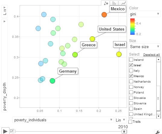 - תרשים אינטראקטיבי: שיעורי עוני ואי שוויון. הגרף מציג נתונים שונים על עוני ואי שוויון בישראל ובמדינות מפותחות אחרות. שיעור העוני בישראל עלה לאורך השנים (אף שחלה בו ירידה קלה בשנים האחרונות) והוא גבוה ביחס למרבית המדינות המפותחות, הן כשמדובר בפרטים והן כשמדובר במשפחות. גם אי השוויון בהכנסות בין משקי הבית בישראל הוא מהגבוהים בעולם המפותח, ונמצא במגמת עלייה ארוכת טווח. גם במדד עומק העוני, (המרחק בין הכנסתן הממוצעת של המשפחות העניות לקו העוני, כלומר עד כמה עניות המשפחות) מצבה של ישראל מחמיר – ההכנסה הממוצעת של משפחות עניות ב-1992 הייתה נמוכה ב-26% מקו העוני, וב-2010 היא הייתה נמוכה ב-31%. (לתרשים לחצו כאן ובחר “Poverty and Inequality”)