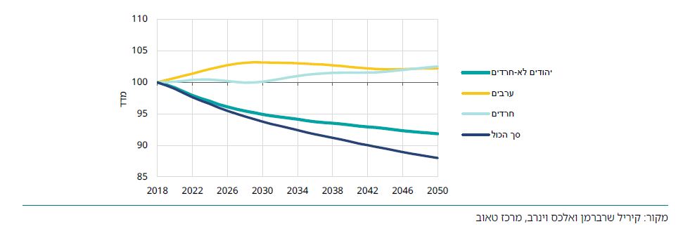 • ערבים וחרדים ישפרו מעט את יחס התמיכה הפיסקלית שלהם (היחס בין תשלומי מיסים לצריכת שירותים) מהרמה הנמוכה שבה הוא נמצא היום, אבל אצל היהודים הלא-חרדים – הקבוצה היחידה שמממנת כיום כמעט את כל צריכתה בעצמה – צפויה ירידה חדה ביחס זה בעקבות הזדקנותה המהירה יותר.